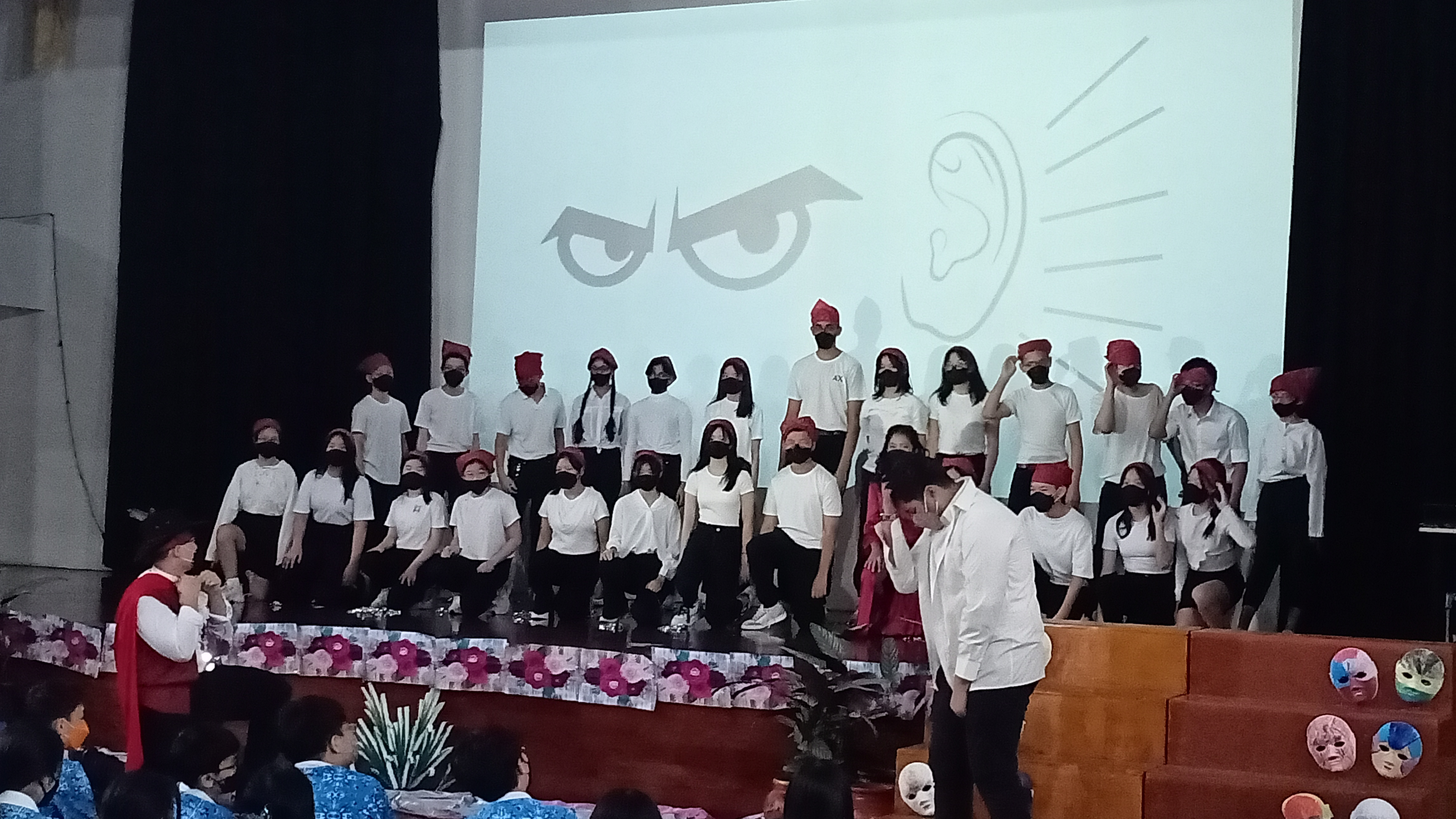 As the person-in-charge of the backgrounds: music, ppt, and sound effects, I learnt two main things: firstly, the importance of coordination- I needed to know the exact timing of when the next song should start, because if I were too early/ late, the rest of the class would be affected too; secondly, I have learnt that taking risks is important. Our class was well-prepared; although it could've been further polished, everything went smoothly during the actual presentation. However, our competitor (Sec 4) had bigger and bolder movements, giving them a stronger, longer lasting impact. With those, the possibility of messing up could be higher, however, the possibility of winning may also significantly rise.